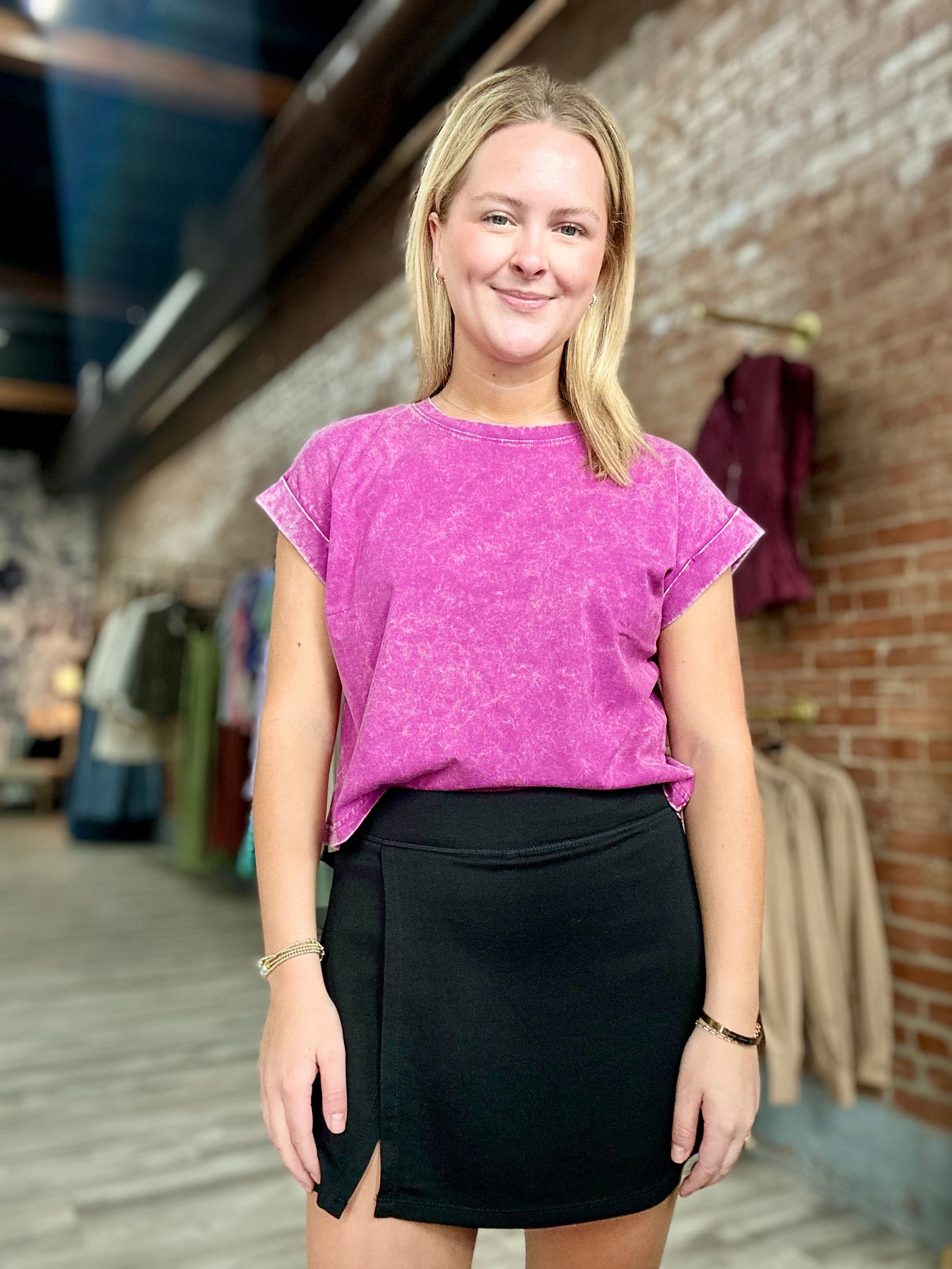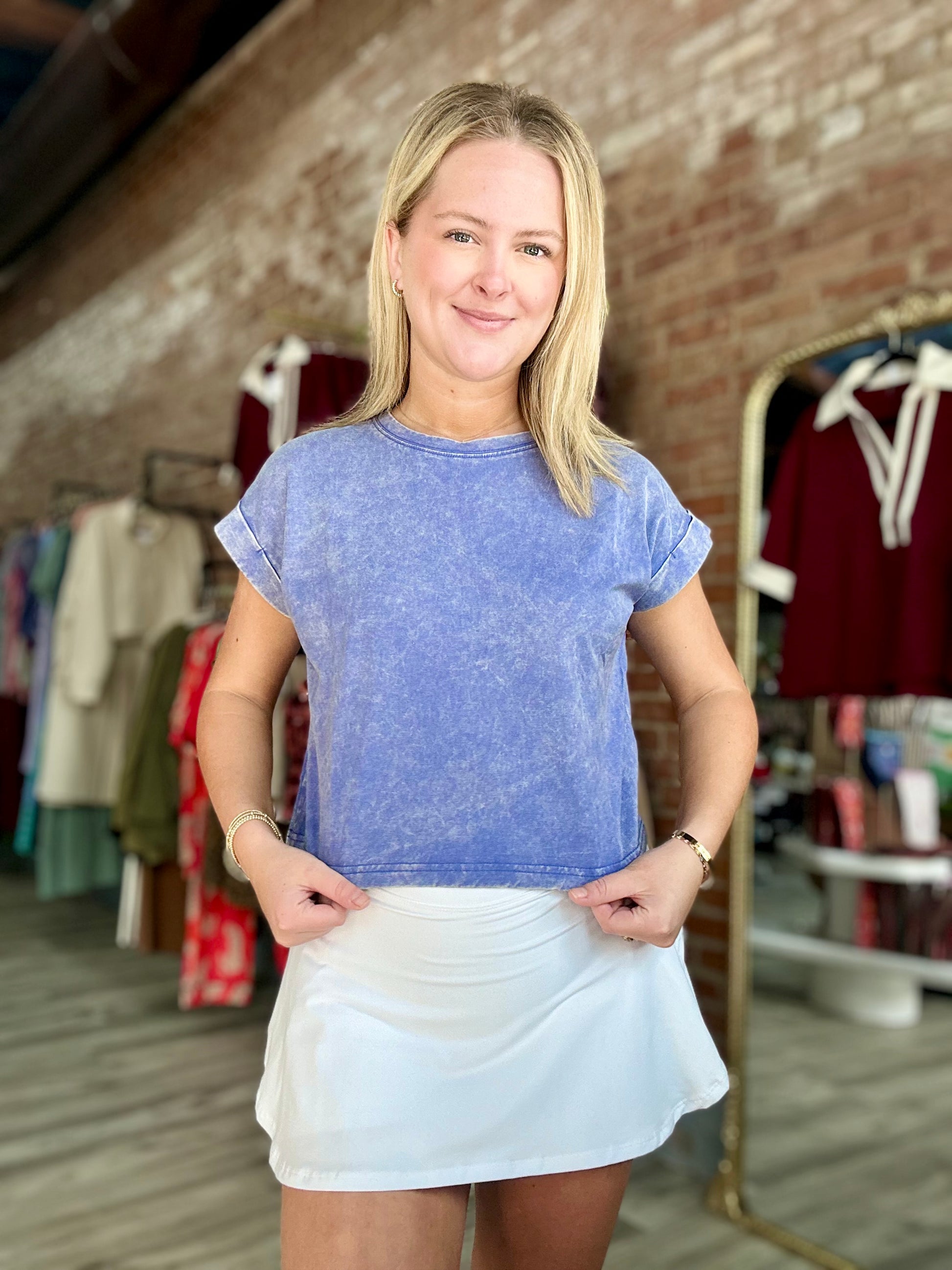 - Our Acid Wash Tee’s are the go-to top in store. They are so easy to dress up or down, and go with any bottom you want to pair it with. They have a cuffed sleeve and are slightly cropped.