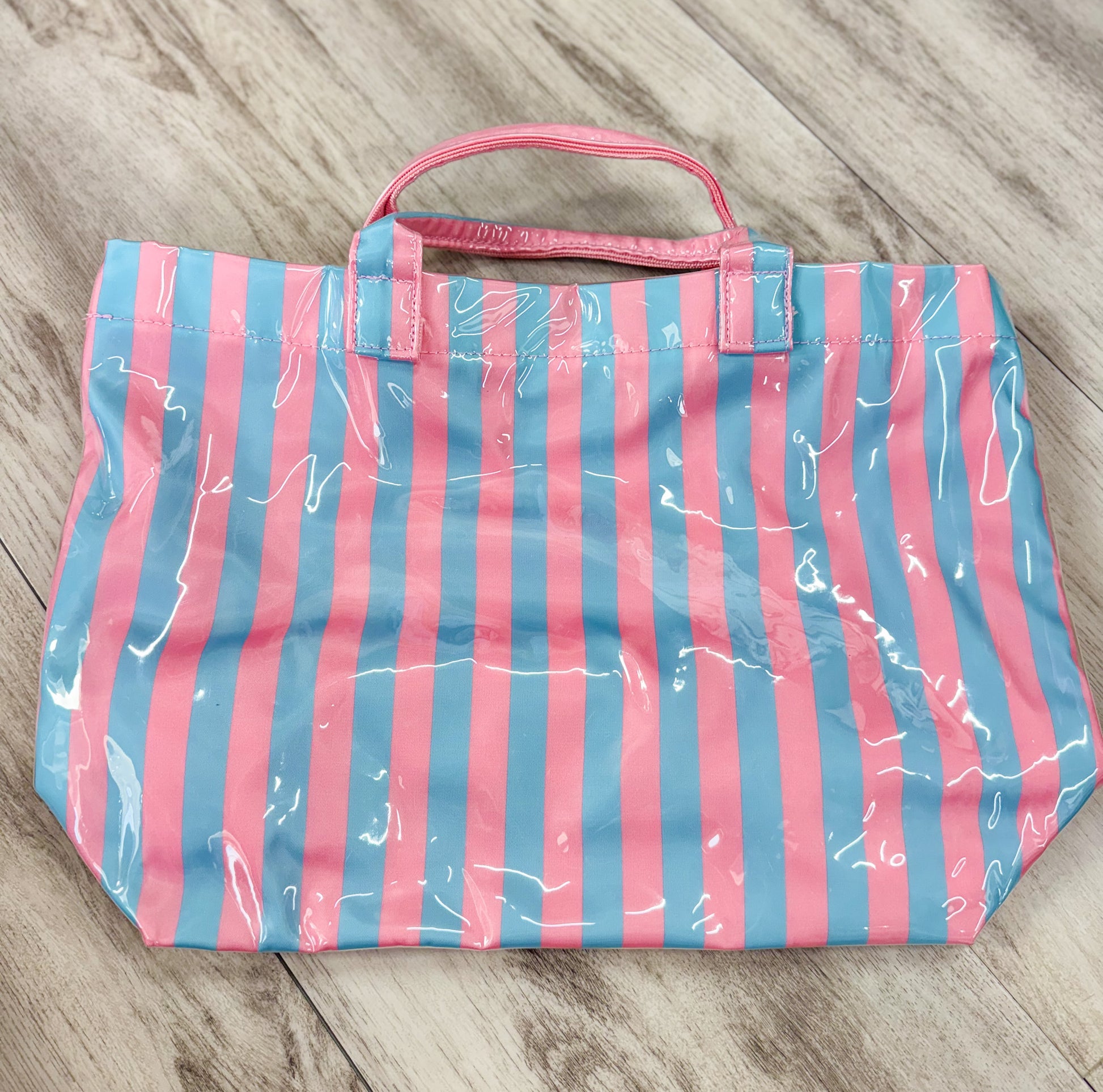 - The most fun colored vinyl striped tote bags for your summer vacay, your lake days & all the in-between swimming trips! They have a waterproof finish & a waterproof lining plus a zip in-closure on the inside and a second bonus pocket. It's a spill-free, mess-free option for the busy mama's, the wet swimsuits and the sandy sandals!