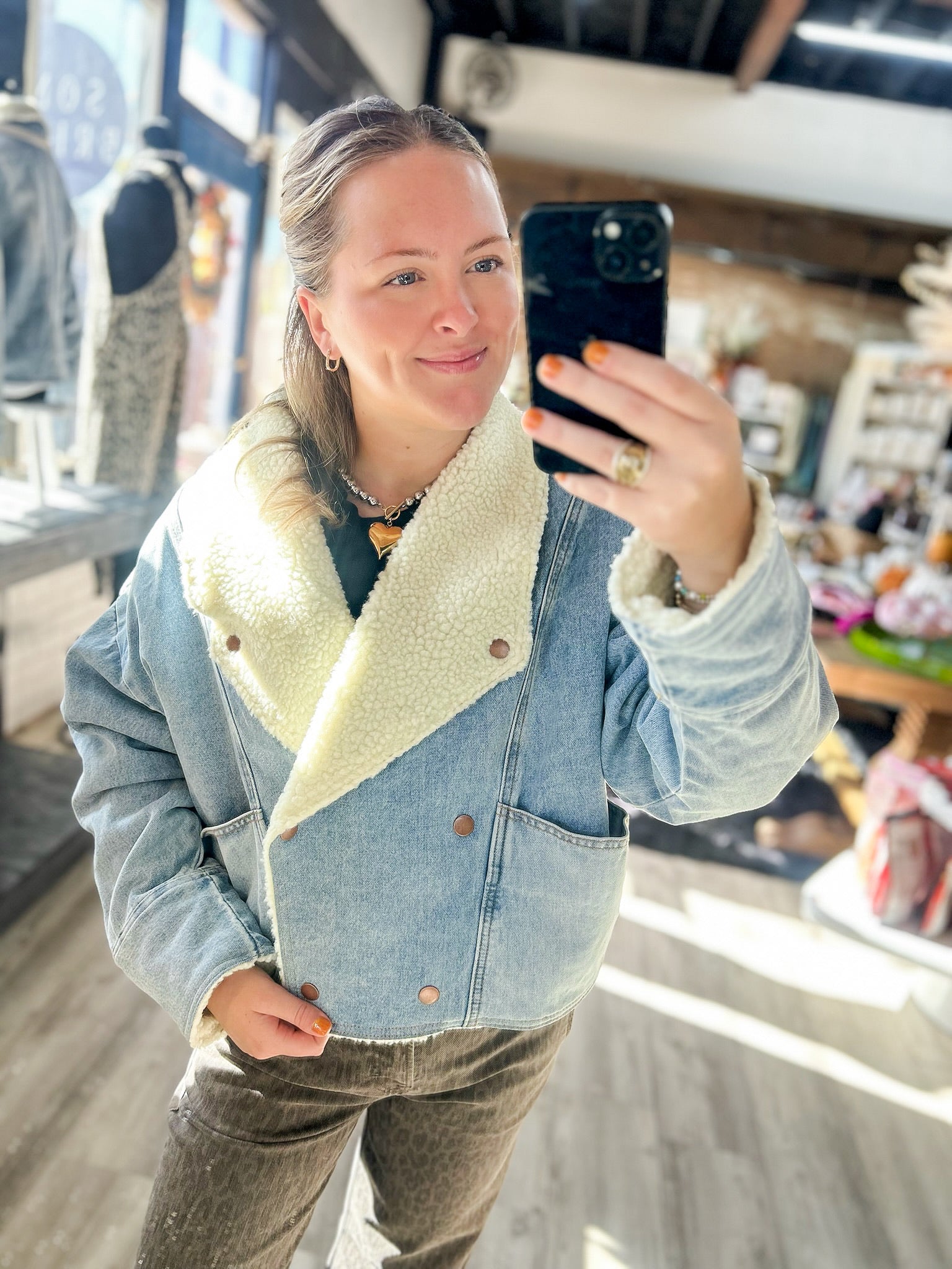 - This jacket is so good that Denim Dan should be jealous… It’s just that GOOD! This sherpa lined denim jacket is going to keep you warm and stylish. With its two front pockets, gold button detailing, and sherpa collar, it has a perfect amount of detailing.