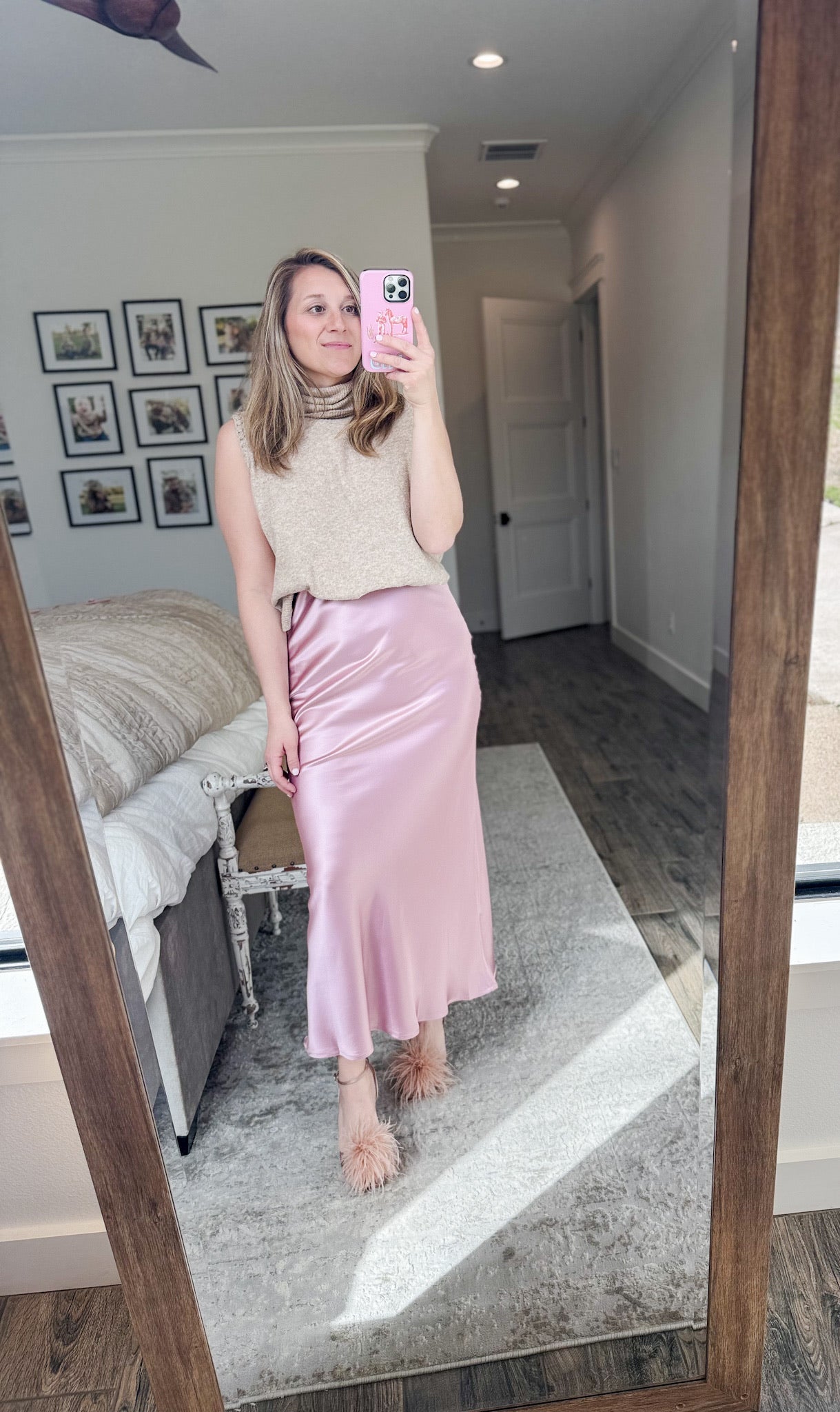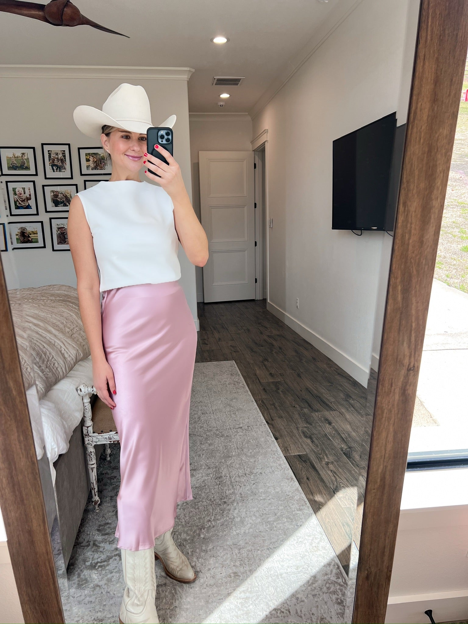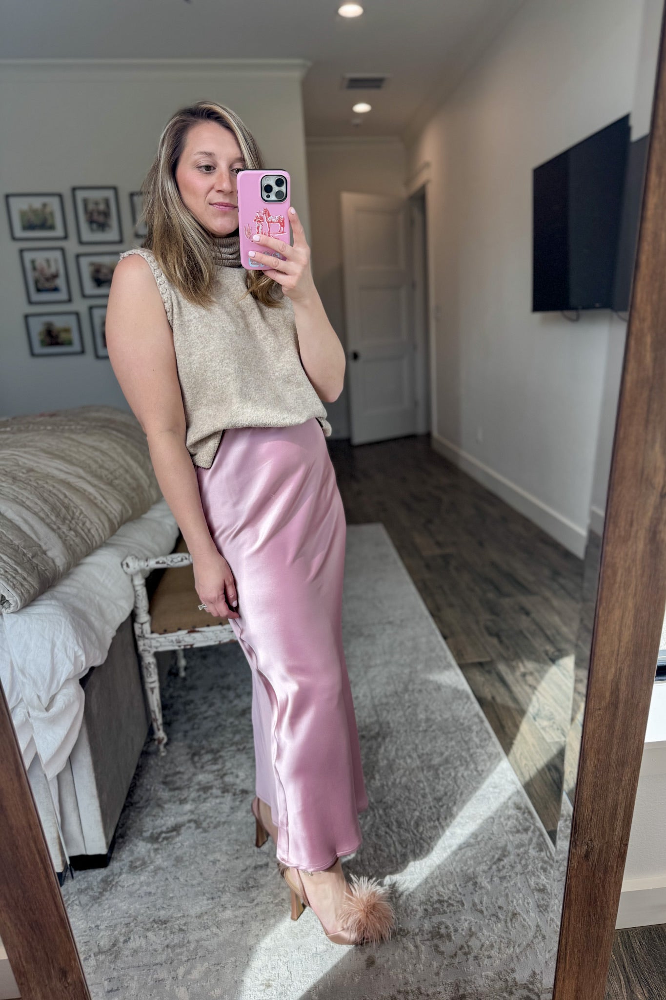 - We love a maxi skirt and this one is nothing short of stunning! A dreamy light mauve color and in the softest satin material. She's a beautiful neutral to pair with a basic tee, a rock tee or dress her up with something special for a wedding guest look or a shower! She'll make for a great addition to any closet!