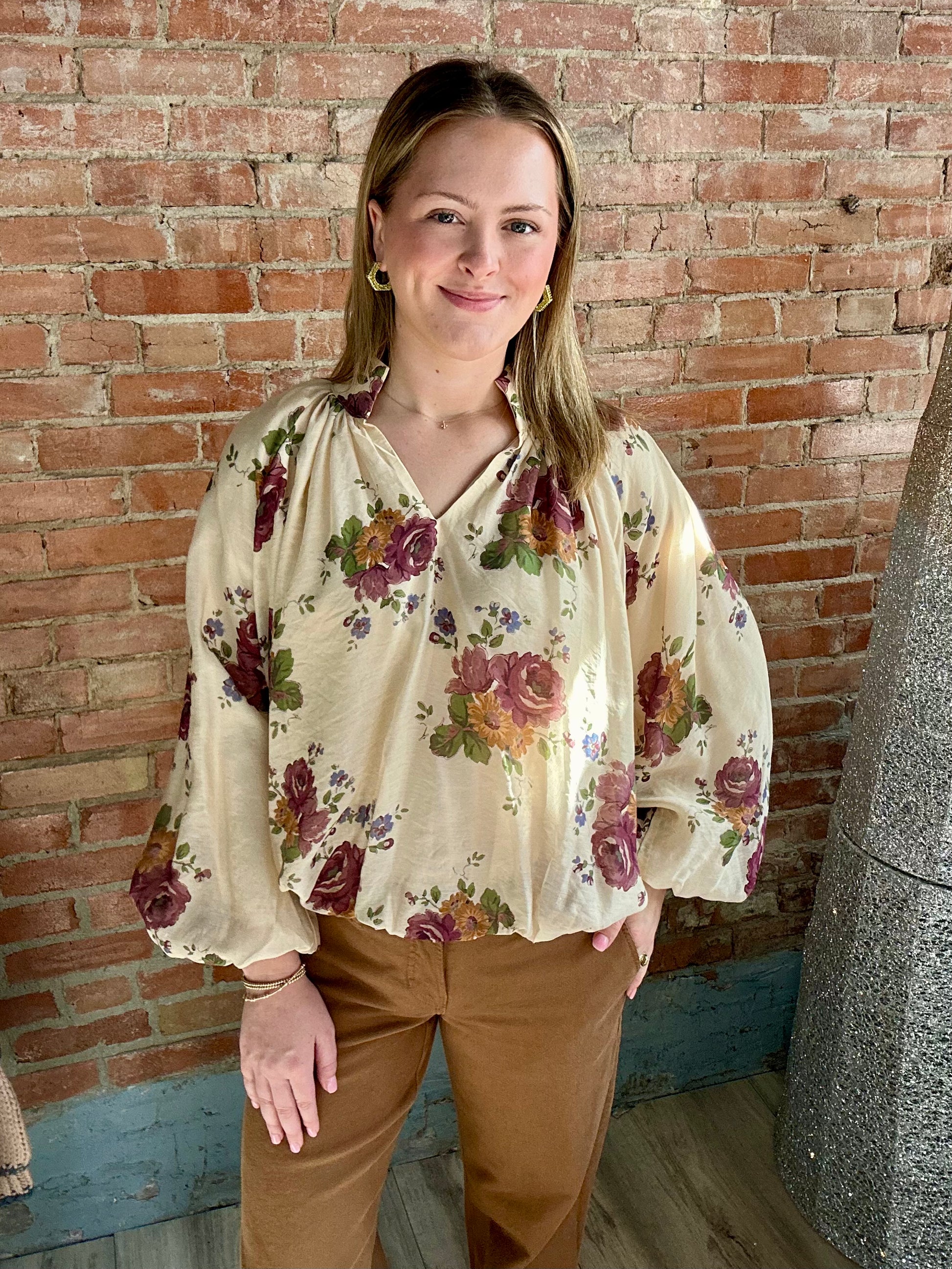 - Our Golden Bloom Blouse is giving all of the fall vibes. It has the prettiest floral print, with purples, yellows and greens. With a slight collar, v-neck and cinched bottom, it adds just the perfect detail to the top. Pair with pants for a perfect church or work look.