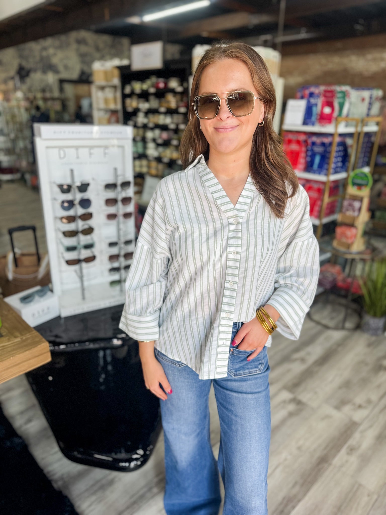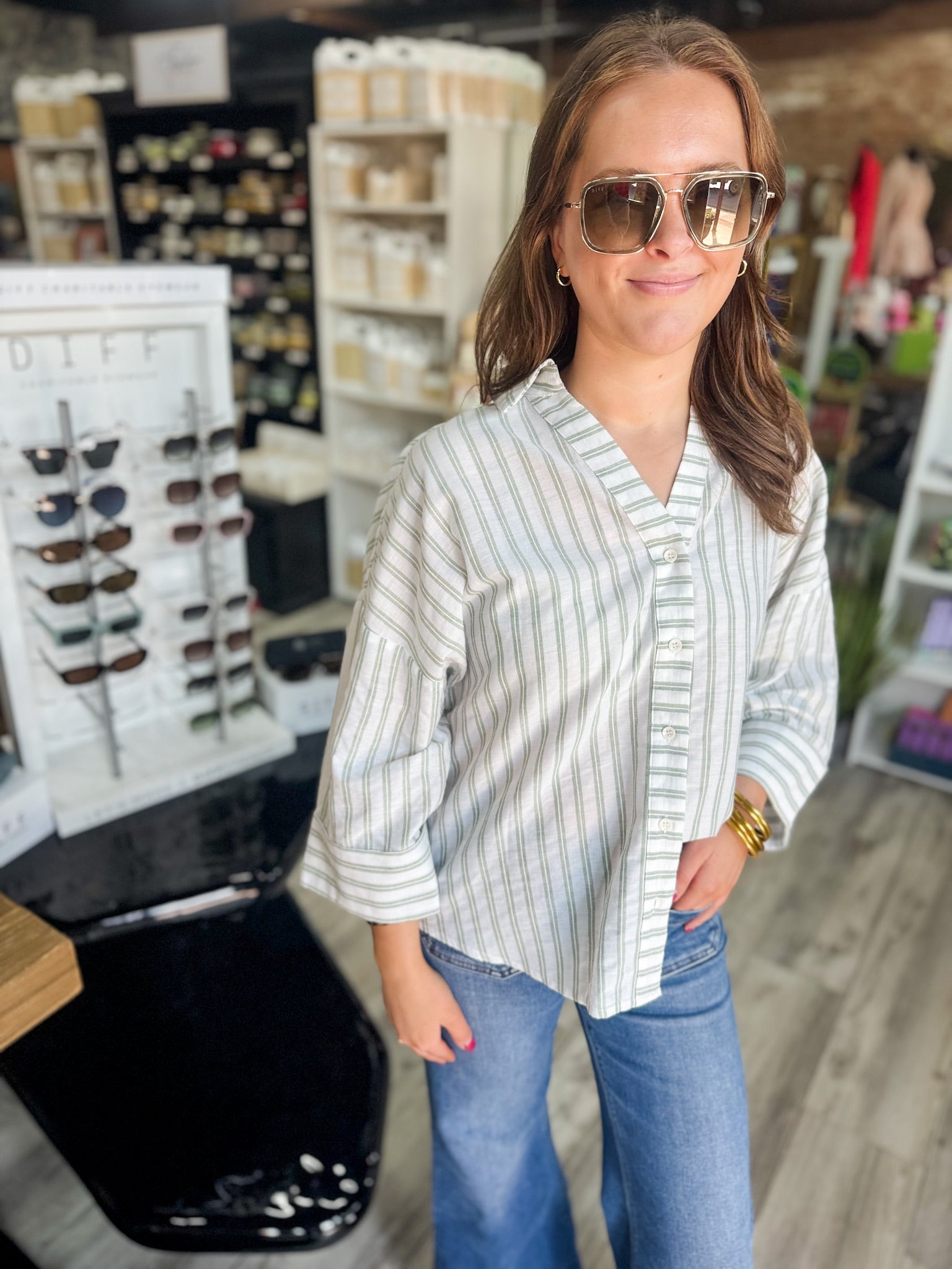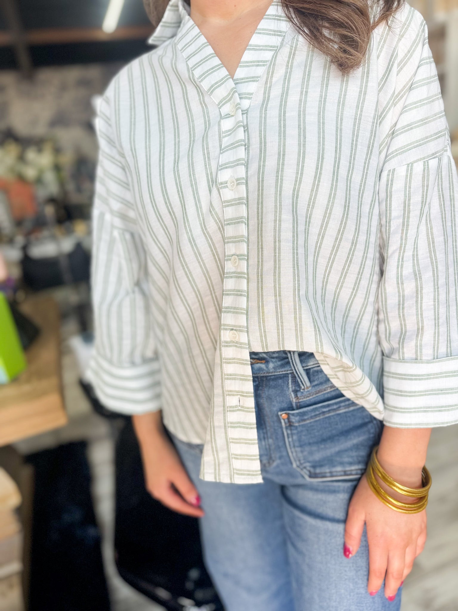 - The perfect transitional button down top in a cream & green stripe print. Comes with wide sleeves a cuff at the sleeve. This relaxed fit top is easy to wear with shorts or jeans and you can dress her up or down.