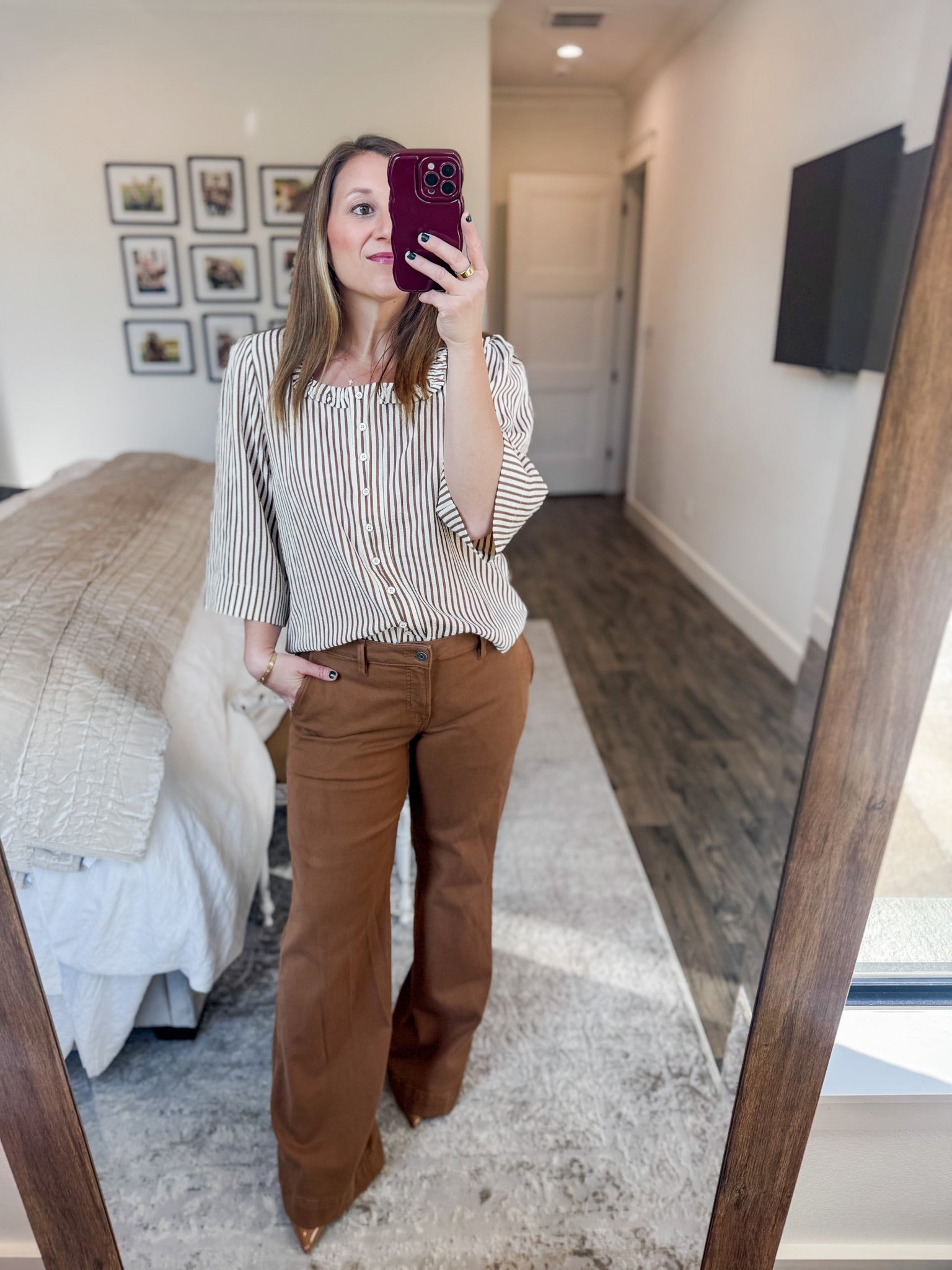 - A charming top with vertical brown and cream stripes, ruffled neckline and button down front. All adding just the right amount of touch to this top! It is light weight and comfy to wear with denim or dress up with pants.