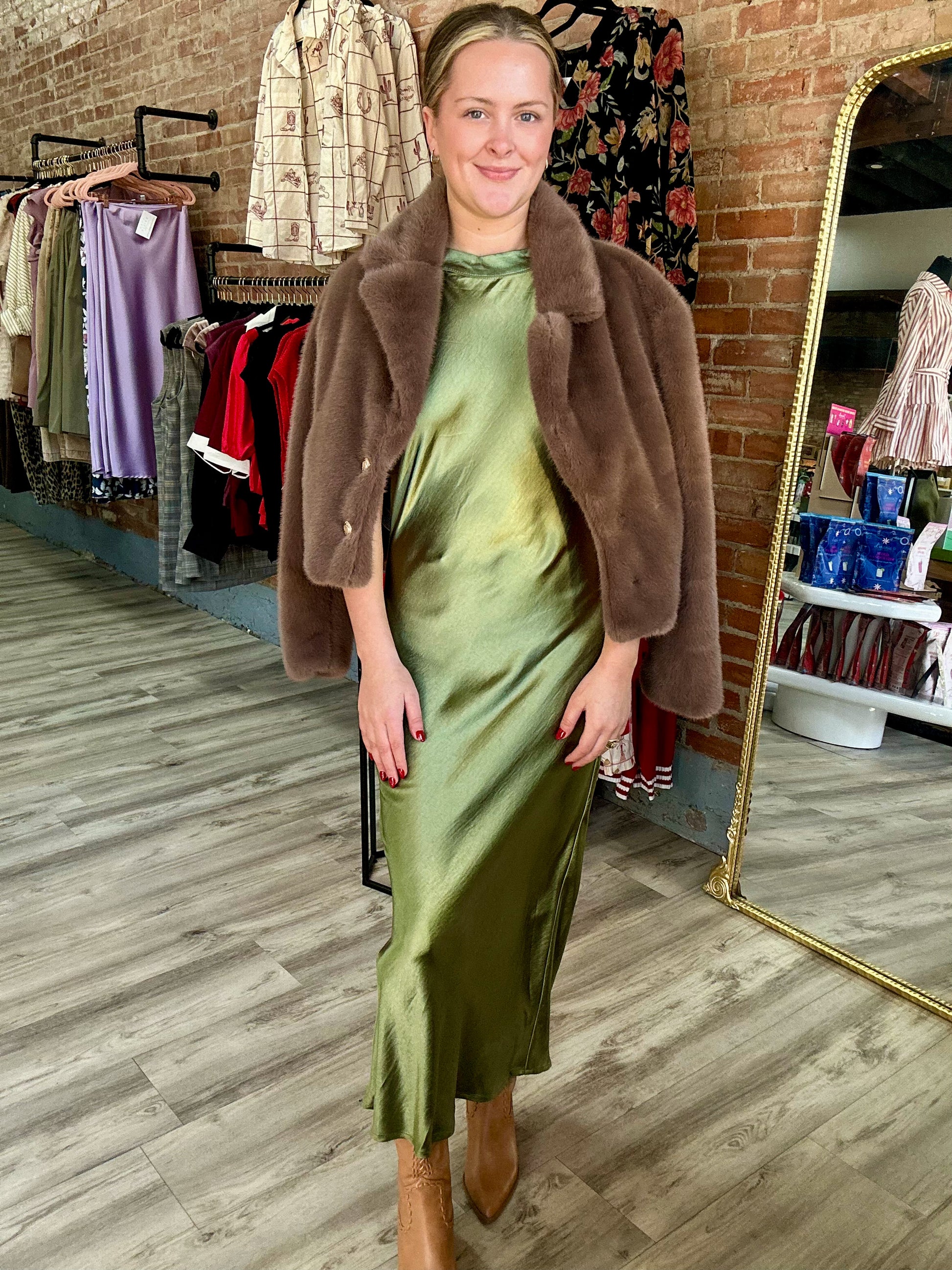 - Your new favorite dress for your next formal event! This soft silky halter dress features an open back and comes in the most gorgeous sienna color. Pair her with heels or throw her on with our camel colored boots and a belt for a dressed up western occasion!