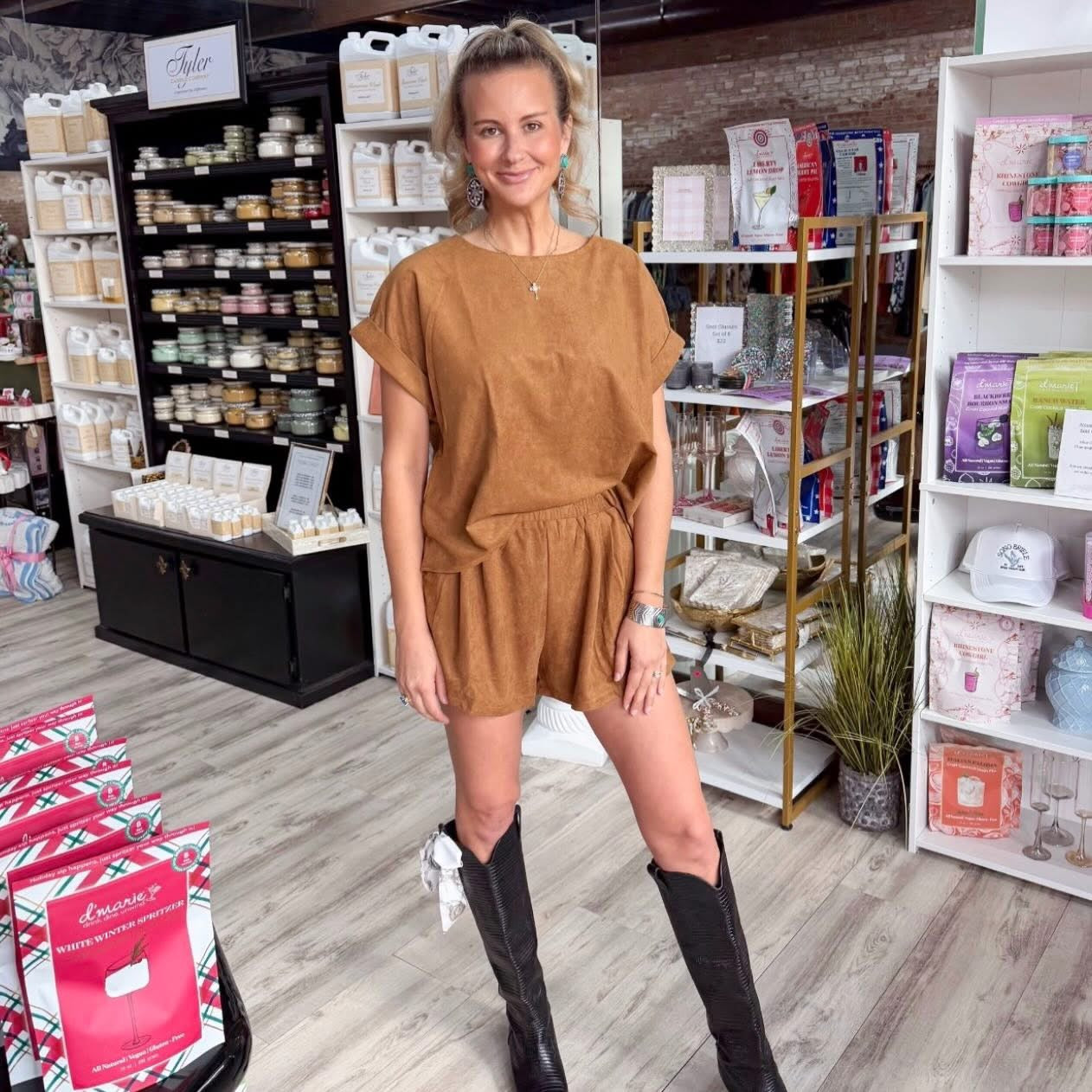 - You can't go wrong with a matching set, especially when they're velvet! These velvet sets come in a hunter green and rust brown color. The tops are oversized and the shorts have a stretchy waistband with pockets. Pair with boots to dress up or sneakers to keep casual.